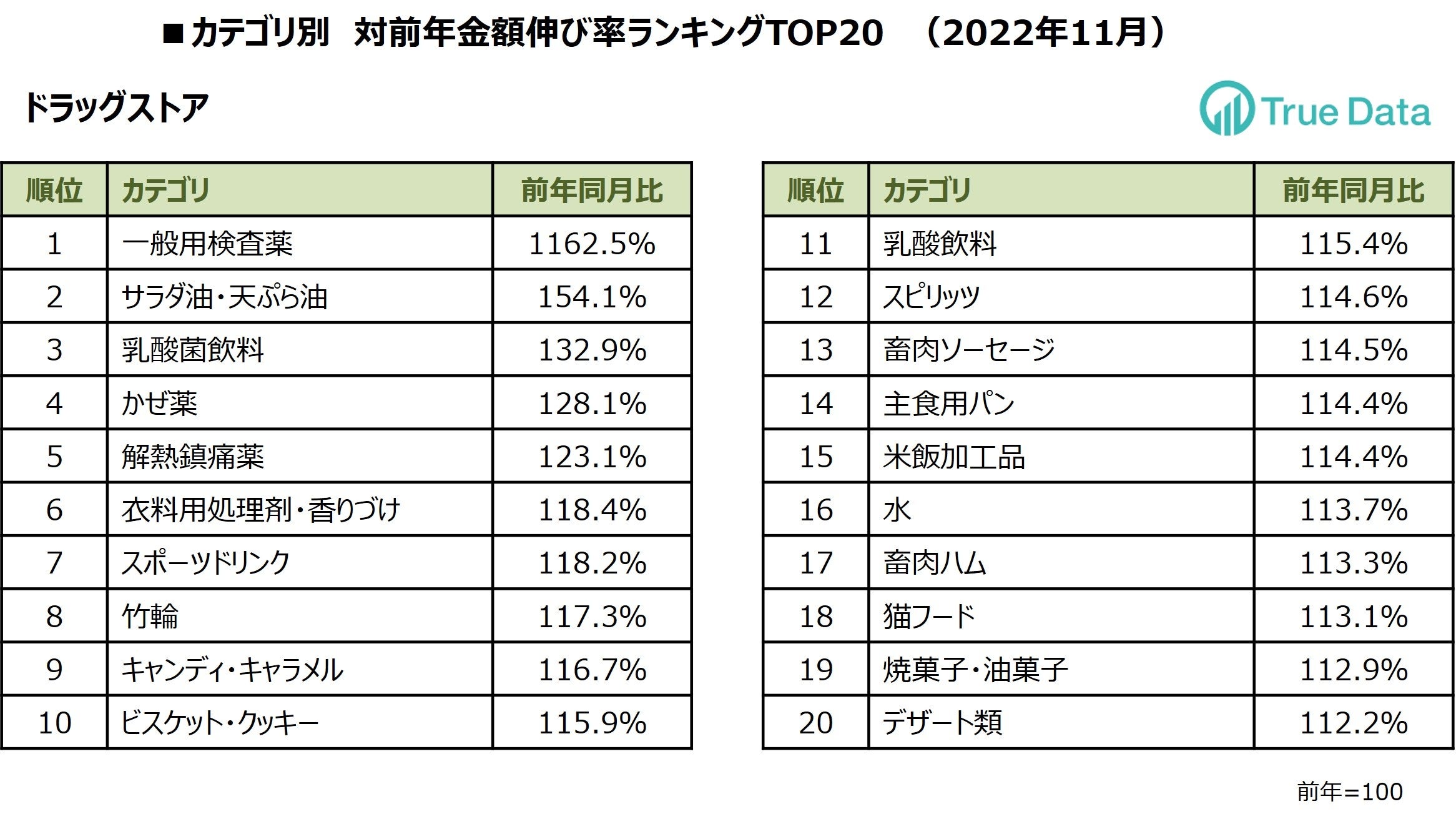 - ドラッグストアでは、「一般用検査薬」(新型コロナウイルス感染症の一般用抗原検査キットなど)が、前年の約12倍(前年同月比1162.5%)と大きく伸長しました。新型コロナウイルス感染者数が増加していることや、テレビCMにより商品の認知が高まったこと、商品の供給体制が整ったことなどにより売り上げが伸長としたと考えられます。