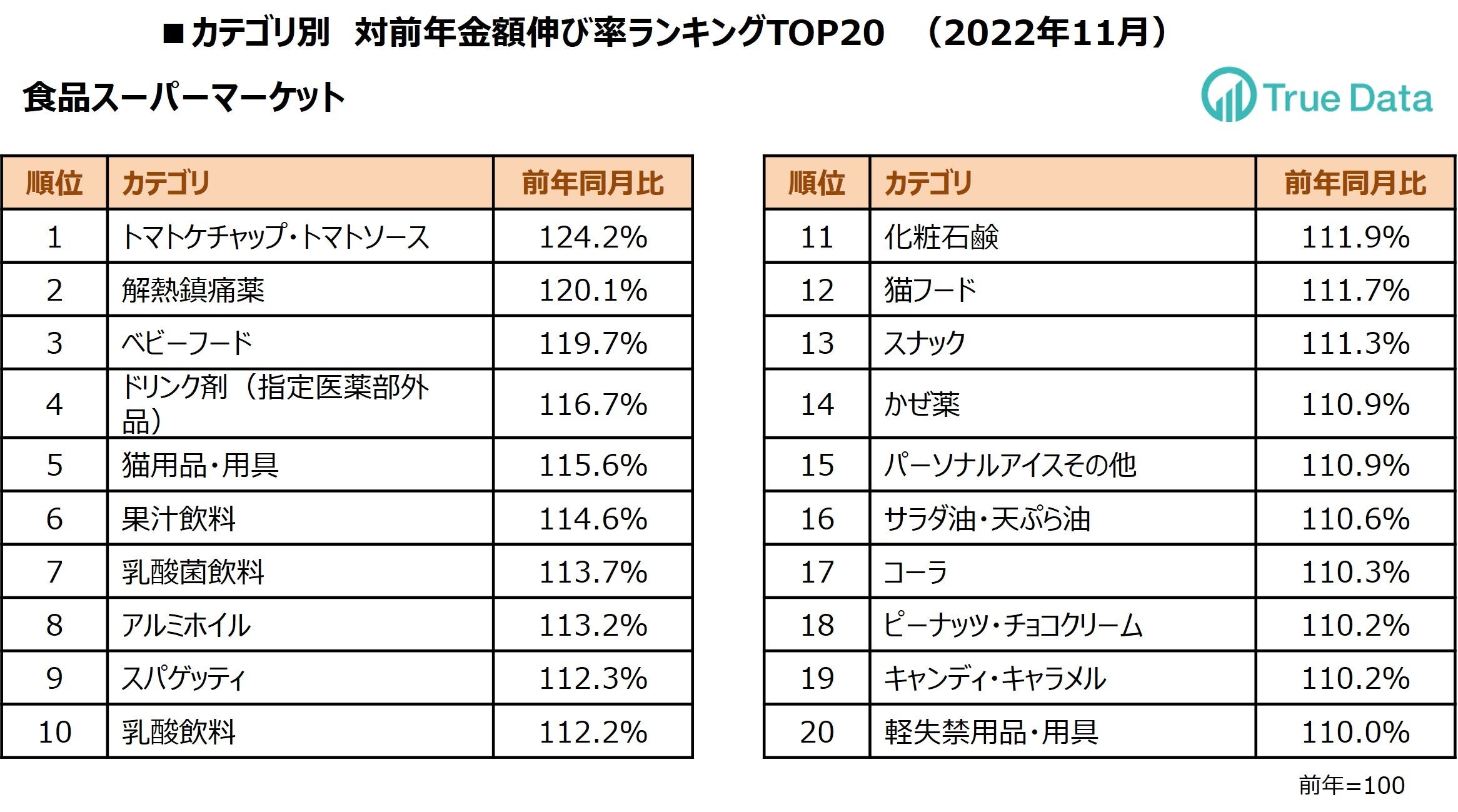 - 食品スーパーマーケットのランキング1位は「トマトケチャップ・トマトソース」でした。メーカー各社は11月に来年2月以降の値上げを発表しており、1月に駆け込み需要が起きる可能性があります。