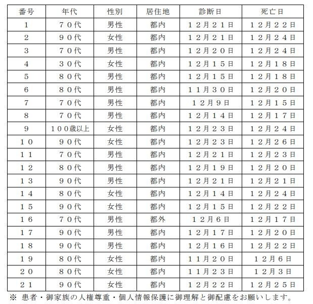 新型コロナウイルスに関連した患者の死亡について business Twitter Facebook はてブ Pocket LINE コピー 2022.12.27 この記事は約1分で読めます。 都内で新型コロナウイルスに感染した方が死亡されましたのでお知らせします。 お亡くなりになった方のご冥福をお祈り申し上げます。 1 新型コロナウイルスに関連した死亡者(本日公表分) 2 新型コロナウイルスに関連した死亡者の累計 6,685人