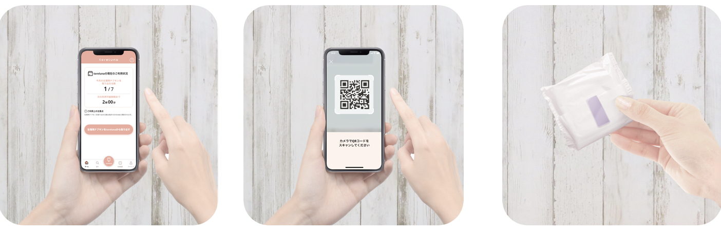 ③アプリを起動し、デバイス横にあるQRコードをアプリ上で読み込みナプキンを受け取る(1回1枚|無料)