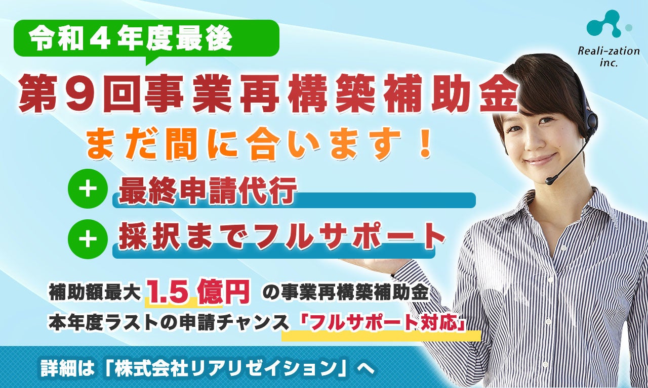 「世界一優しい行政手続きに」をキャッチコピーとする、株式会社リアリゼイション(本社:東京都渋谷区)は、令和4年度最後の「第9回事業再構築補助金」の申請サポートを、緊急追加募集いたしました。
