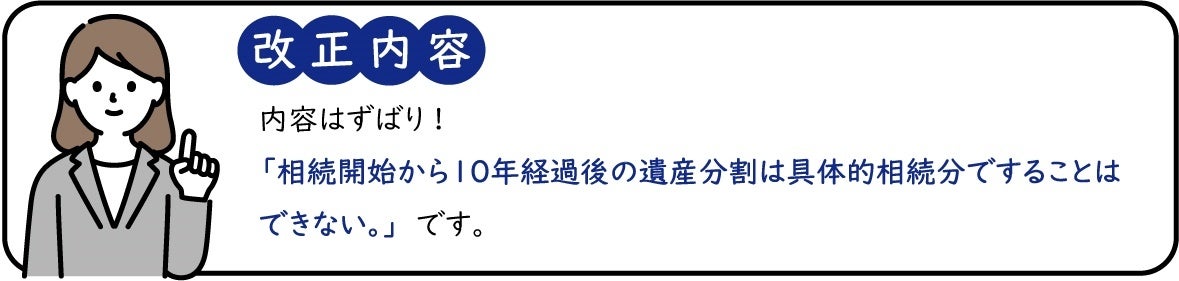 それによって所有者不明不動産が増えてしまって空き家が増えたり、活用などができなくなるなどの不都合がでてきてしまった。そこで、遺産分割の早期解決を目的として期間制限を設けたということのようです。