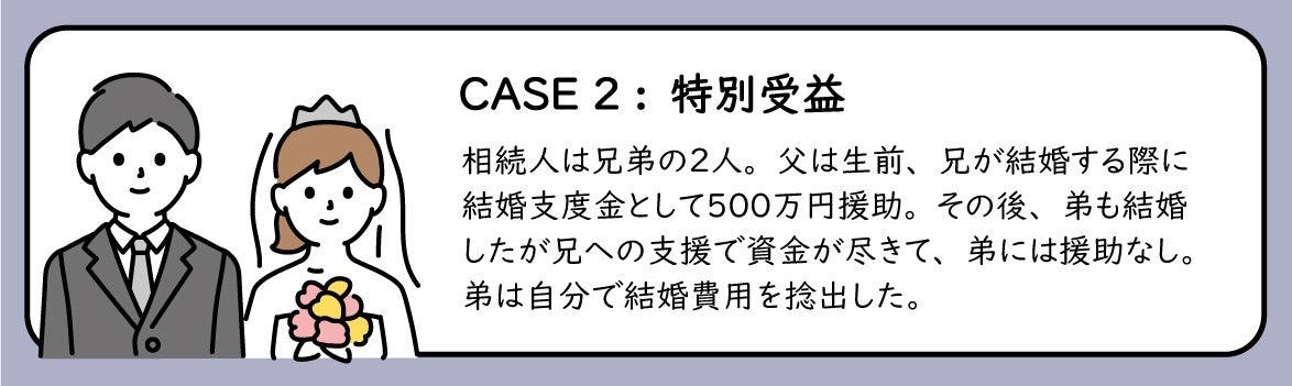 この「結婚支度金として500万円援助してもらった」ことを「特別受益」と言い、相続財産から特別受益分を足した金額で遺産分割をします。