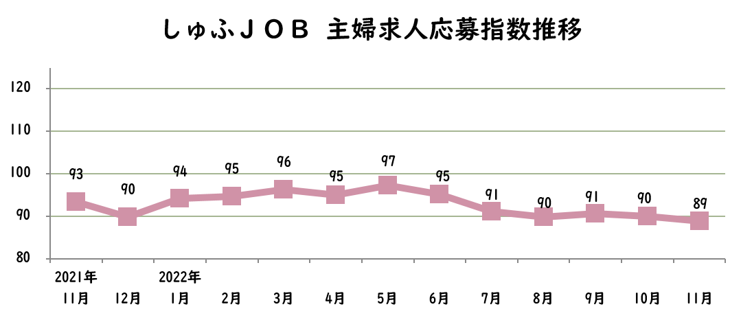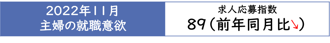 応募指数は比較可能な2016年7月以降で2番目の低さとなった。新型コロナウイルス感染拡大の影響で2020年6月には130まで上昇したが、その後求人数の回復に伴い下降。2021年7月以降はペースが緩やかになったものの、需要が供給を上回っており依然として下降傾向となっている。例年通りであれば、1月以降主婦層の就職意欲は回復傾向になるとみられる。