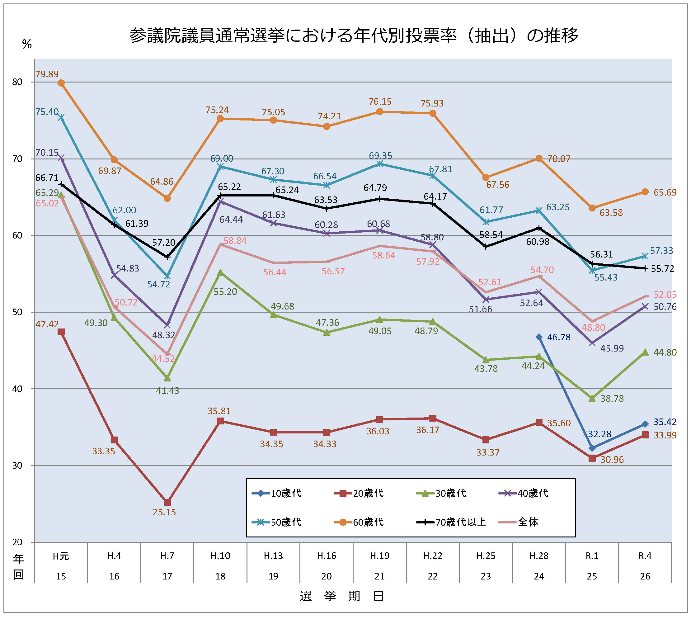 出典:総務省 国政選挙における年代別投票率:https://www.soumu.go.jp/senkyo/senkyo_s/news/sonota/nendaibetu/