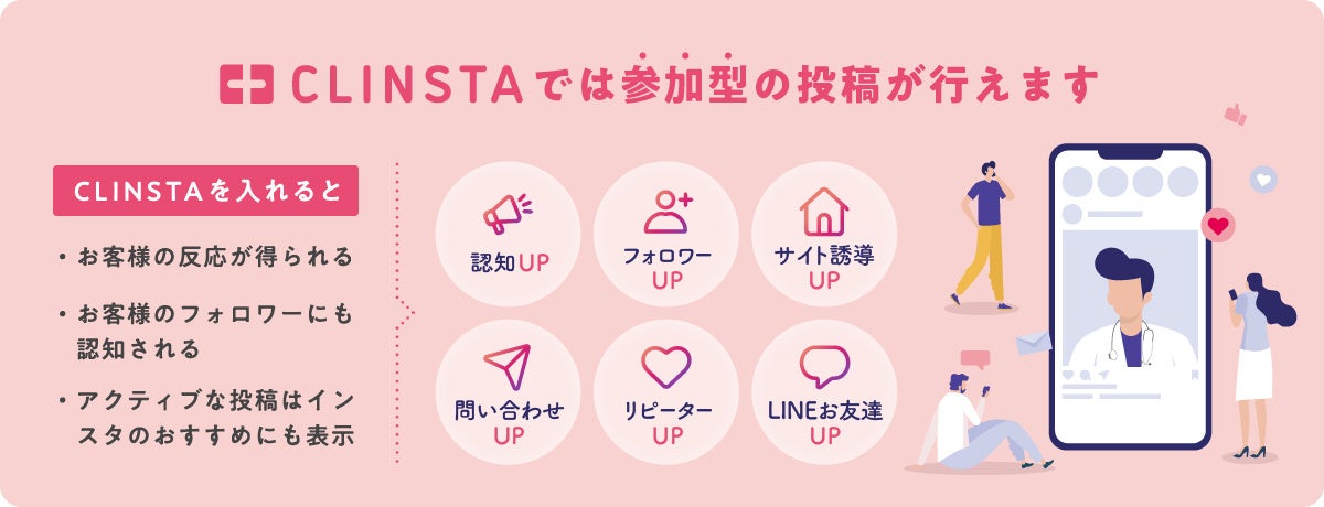 インスタグラムは、今やクリニック集客の要。WEBマーケティングで活用しない手はありません。有効活用のポイントは双方向性。いかにユーザーのアクションを引き出すかです。CLINSTAならそれを実現できます。SNSからのクリニック集客にお悩みの方は、是非お問合せください。