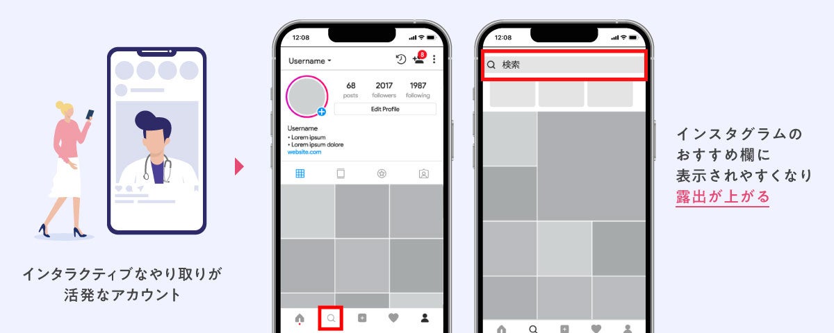 美容クリニックの集客において、SNSは無視できない存在です。とりわけインスタグラムは、画像、動画といった視覚情報と文章を組み合わせて、手厚く情報を届けることができるのが大きな特徴。最近では検索媒体としての使用頻度も高く、情報収集のために活用されるケースも少なくありません。「顧客の育成・教育に適したプラットフォーム」と言われるのはこのためです。