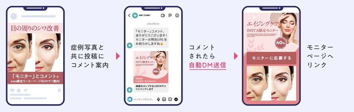 モニター募集のコメント欄に、ある特定のワード(例えば「モニター」など)を入力・送信した方に、自動でDMを送ることが可能です。通常のフィードにはURLを添付できませんが、それをDM内で実現します。見せたいURLを直接ご案内できるので、離脱のリスクを減らすことができます。