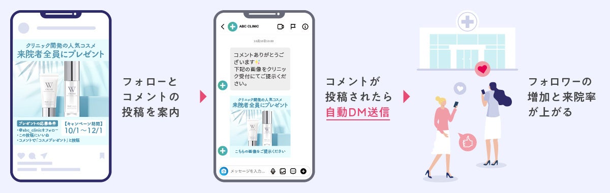 プレゼントキャンペーンの参加条件に、コメント欄で特定の文言を送信するよう求めます。コメントを送信した方には、プレゼントとの引き換えに必要なクーポンをDMで自動送信します。これによって、来院率のアップやフォロワー増などが期待できます。