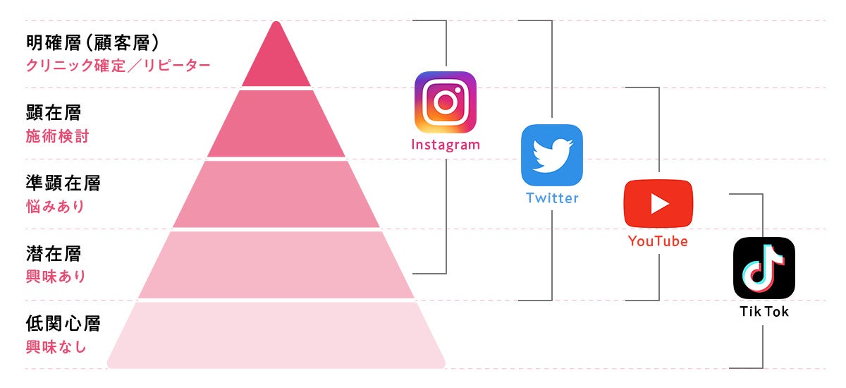 美容クリニックの集客において、SNSは無視できない存在です。とりわけインスタグラムは、画像、動画といった視覚情報と文章を組み合わせて、手厚く情報を届けることができるのが大きな特徴。最近では検索媒体としての使用頻度も高く、情報収集のために活用されるケースも少なくありません。「顧客の育成・教育に適したプラットフォーム」と言われるのはこのためです。