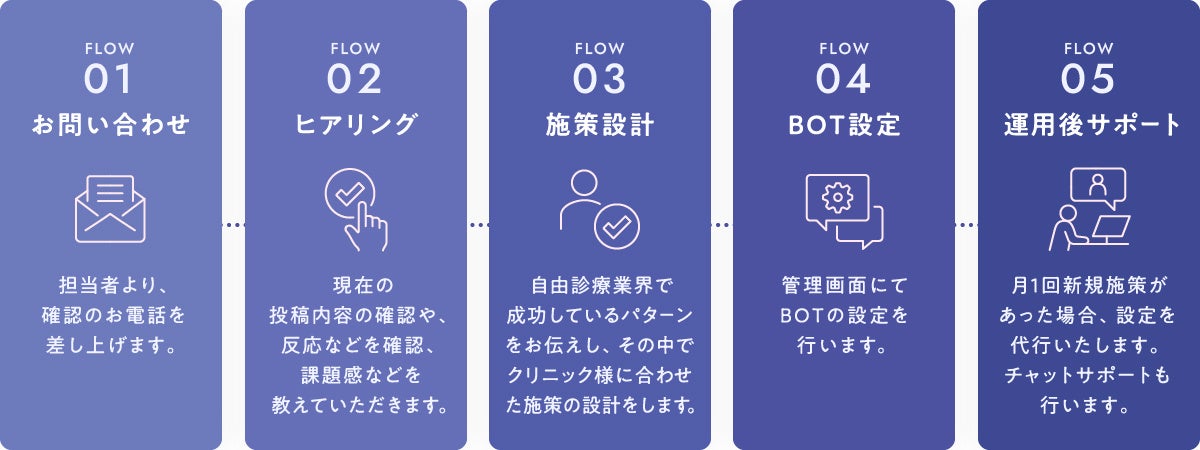 ユーザーアクションをきっかけにDMを自動で送信し、CVへの誘導を強化します。また、一度設定すれば、人的なコストをかけずに継続的に問い合わせを増やすことが可能です。