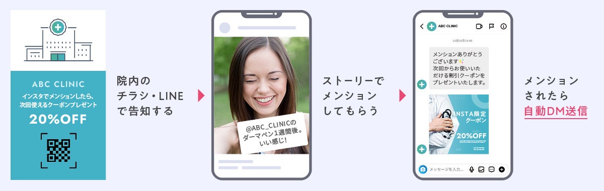 自施設で施術を受けた方に、ストーリーでのメンションを依頼します。メンションしてくださった方には、インセンティブのご案内をDMで自動送信。リピートを促します。また、実際に施術を受けた人の自発的な発信は信頼度が高いので、新規獲得の後押しにもなります。