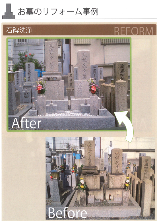 (長年、水垢で汚れていたお墓をきれいに洗浄しました。)