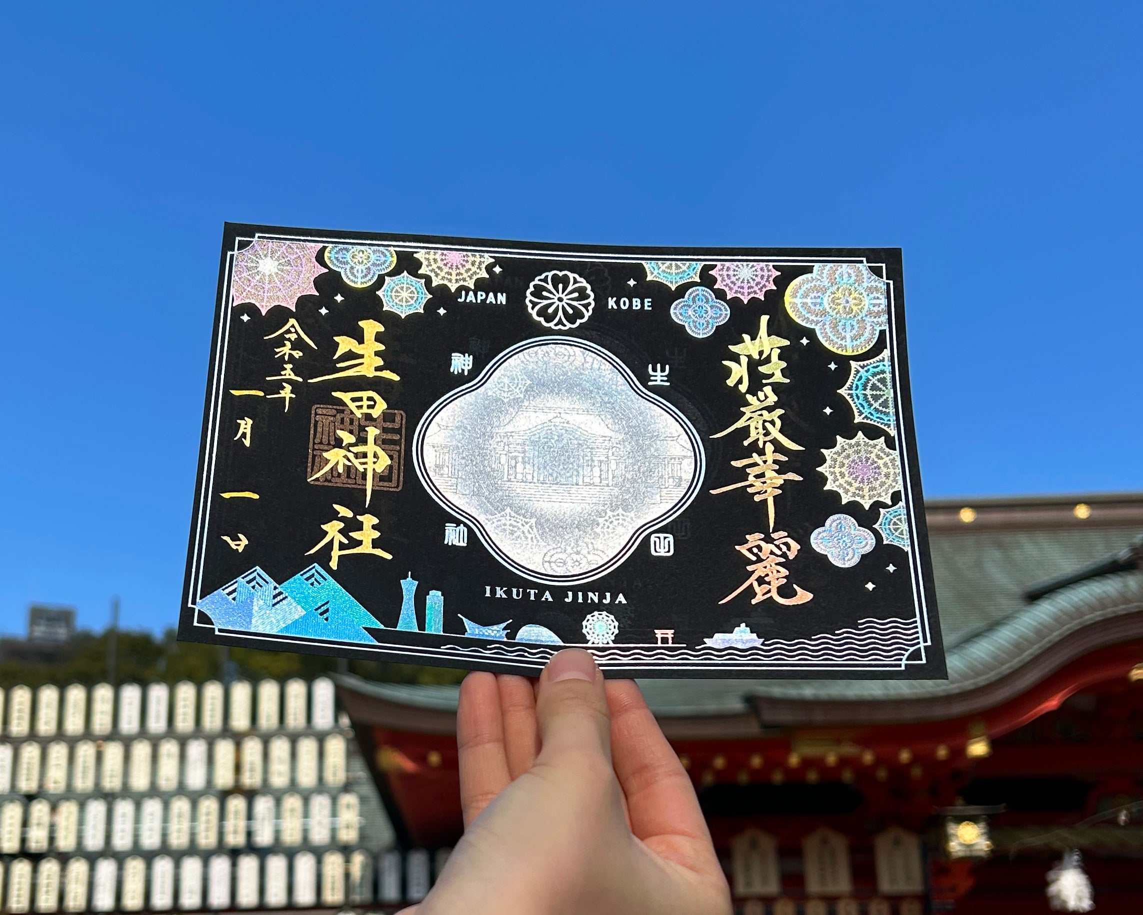 この御朱印は、幻想的に輝く社殿を中央に、周りには夜の神戸の街を彩り豊かなイルミネーションが光り輝き、威厳があり華やかな様子を表す「荘厳華麗」を、「エッチング加工」という匠の技法により複雑な煌めきで表現し、特別に仕上げた冬季限定の御朱印です。