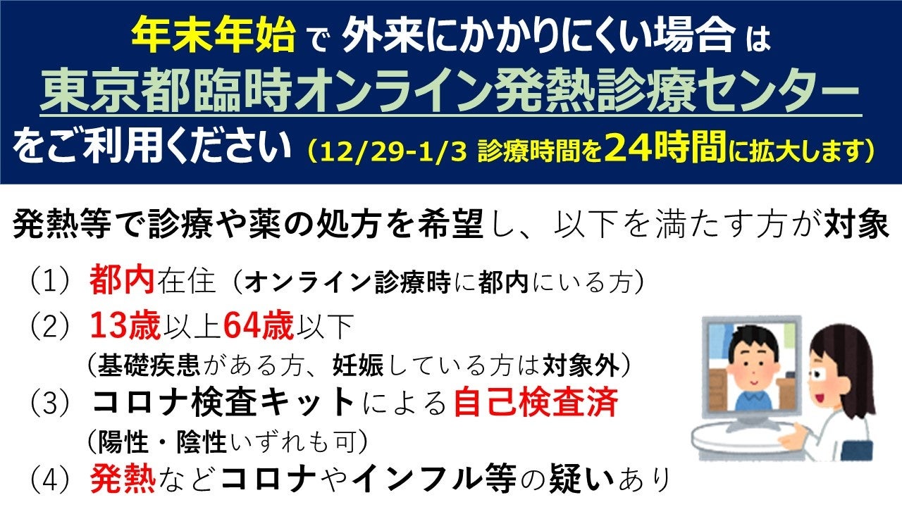年末年始は、診療体制が通常とは異なります。 発熱などのコロナ を疑うような症状が出てしまったときに備え、重症化リスク等に応じた行動を予めご確認ください。