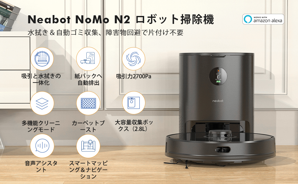- ❸【水拭き&ゴミ収集全自動】 Neabot N2 ロボット掃除機 自動ゴミ収集 水拭き機能搭載 自動充電/ゴミ排出 LEDディスプレイ付 スマートマッピングトラブル回避/衝突・落下防止 2700Pa 掃除時間/範囲/回数を設定 Wi-Fi接続 Alexa対応 (ブラック)