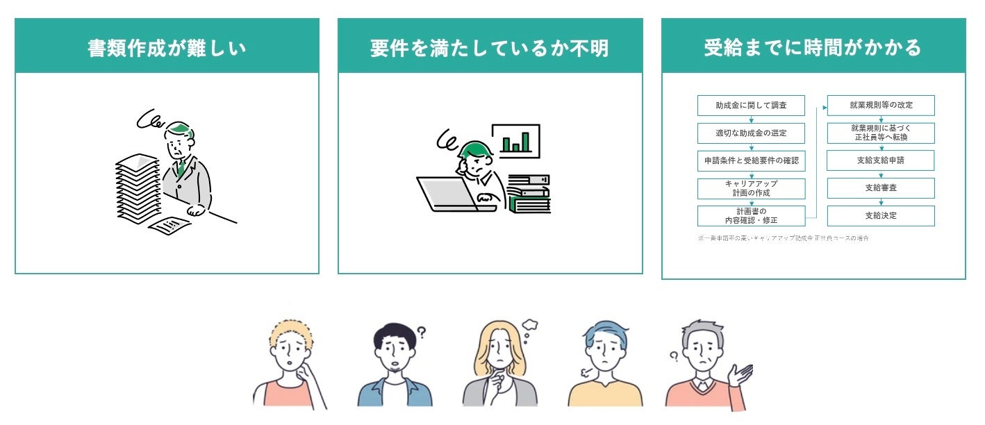 「概要やマニュアルも数十ページを超えており膨大」「自社が助成金の申請要件を満たしているのか判断できない」「助成金の種類が多く要件も複雑」……ラクリア助成金は、そんな皆さまの声から生まれました。
