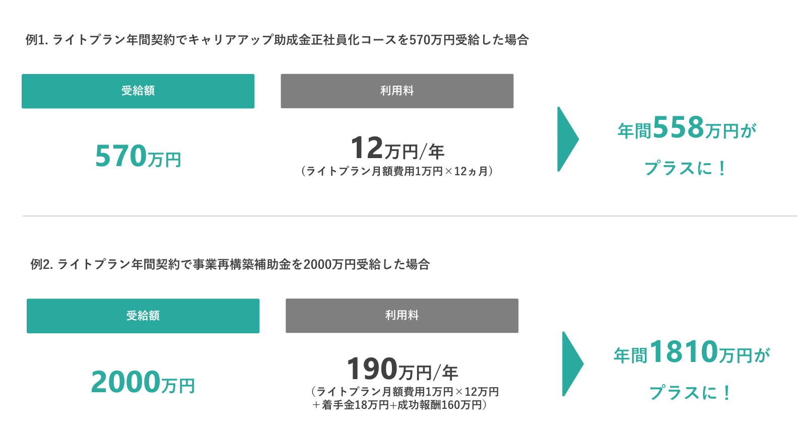 例1:ライトプラン年間契約でキャリアアップ助成金正社員化コースを570万円受給した場合