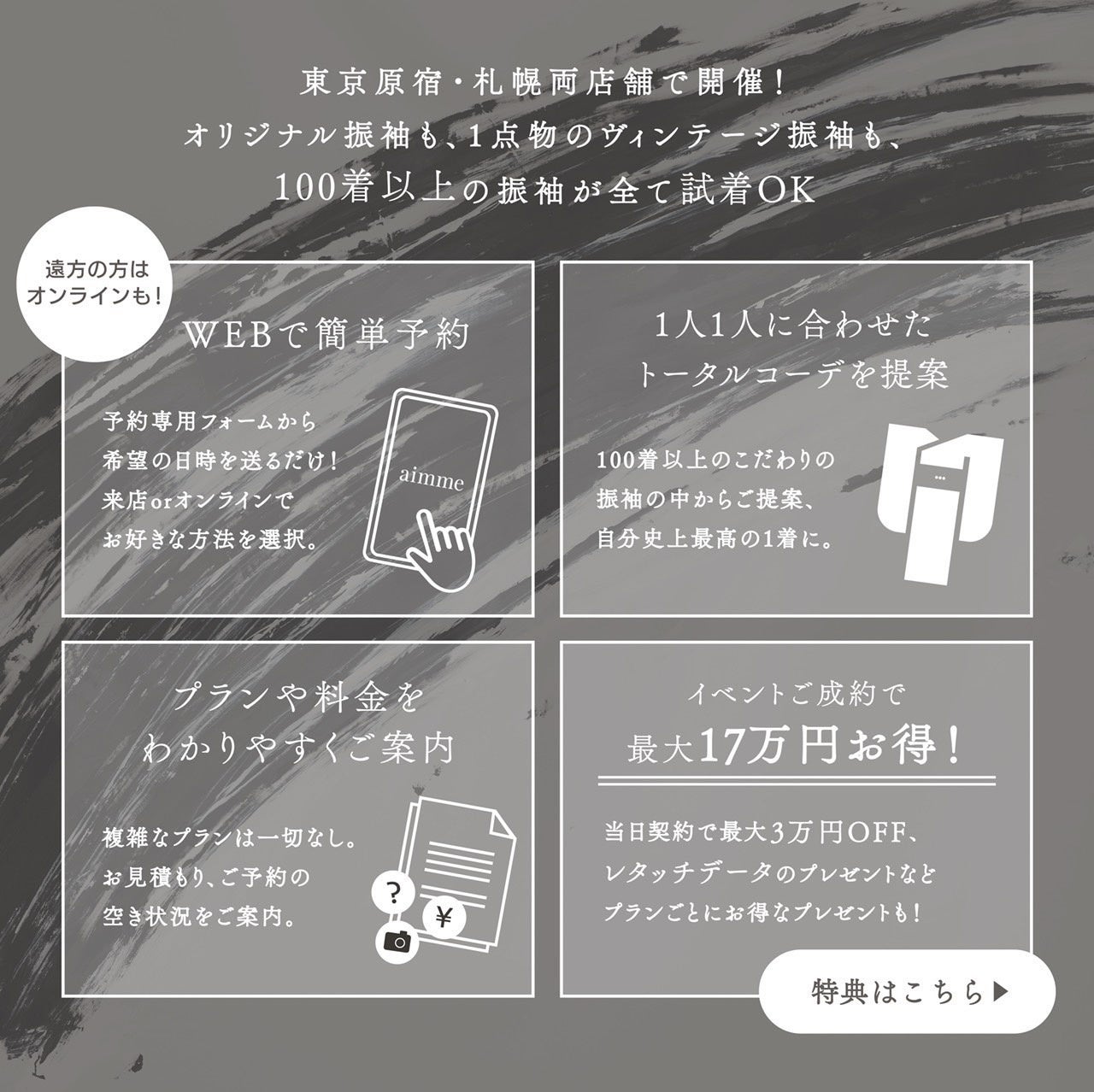 aimmeの振袖は東京・札幌の2都市に限らず、札幌展では北海道全域、東京原宿展では青森から沖縄まで、合わせて全4 7都道府県、つまり、日本全国へaimmeの振袖を提供可能。