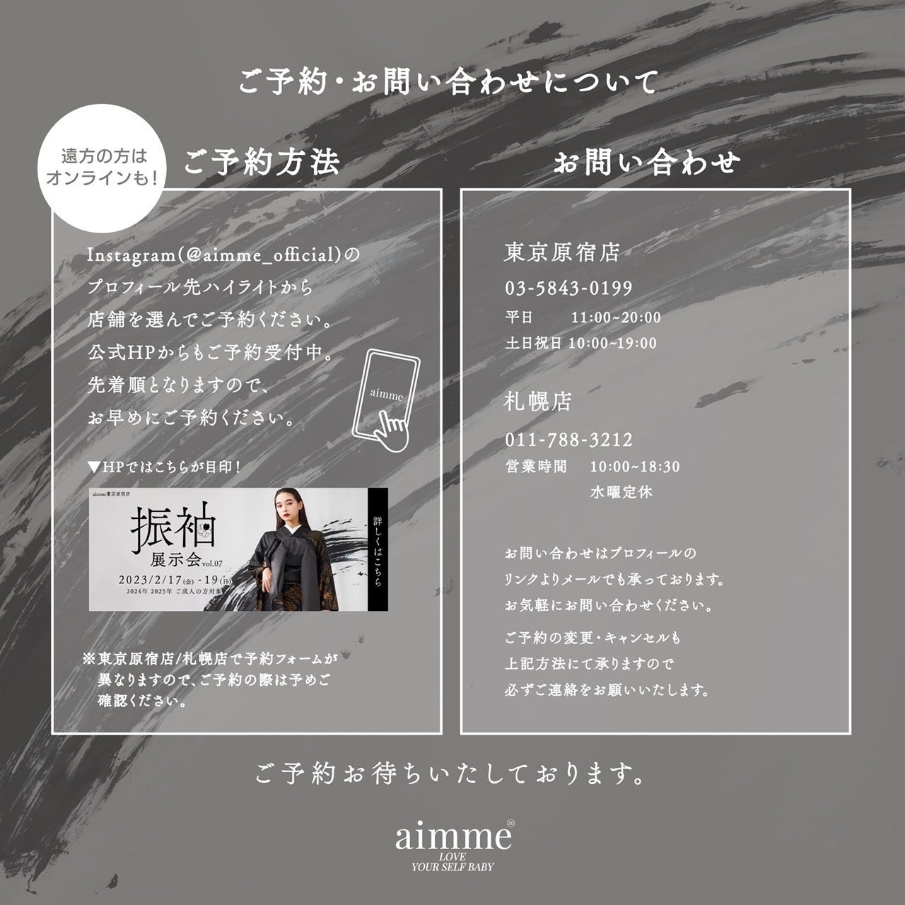 そんなaimmeが主催する振袖展示会も今回でなんと7回目。新たに金糸刺繍の黒染め振袖が登場。その他人気の1点ものヴィンテージ振袖、昨年大好評だったaimmeこだわりのオリジナルラインに合わせ、aimmeスタイリストが厳選したお洒落な計150着以上もの振袖を展示。