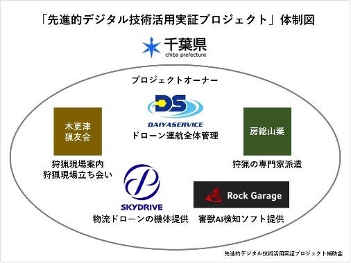 このような中、AIを活用したドローンを開発する株式会社ロックガレッジ、物流ドローンを開発を行う株式会社SkyDrive、有害鳥獣の捕獲・防護方法のコンサルティング・資器材の開発を行う合同会社房総山業、狩猟に関する教育・訓練を行う木更津猟友会、そしてドローン運航事業を行う当社がそれぞれの強みを活かし、プロジェクトを推進することで、千葉県の害獣駆除の課題を解決できると考え、「先進的デジタル技術活用実証プロジェクト」を推進することとなりました。