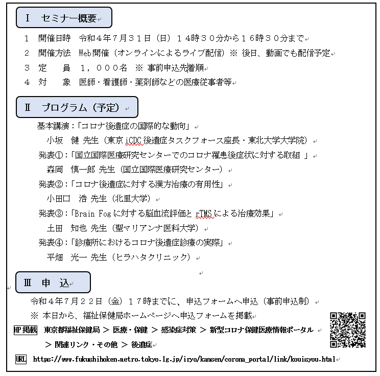 本セミナーでは、専門家や後遺症治療に当たっている医師等を講師に、後遺症の実態や治療方法等、最新の知見や情報を提供いたしますので是非御参加ください。