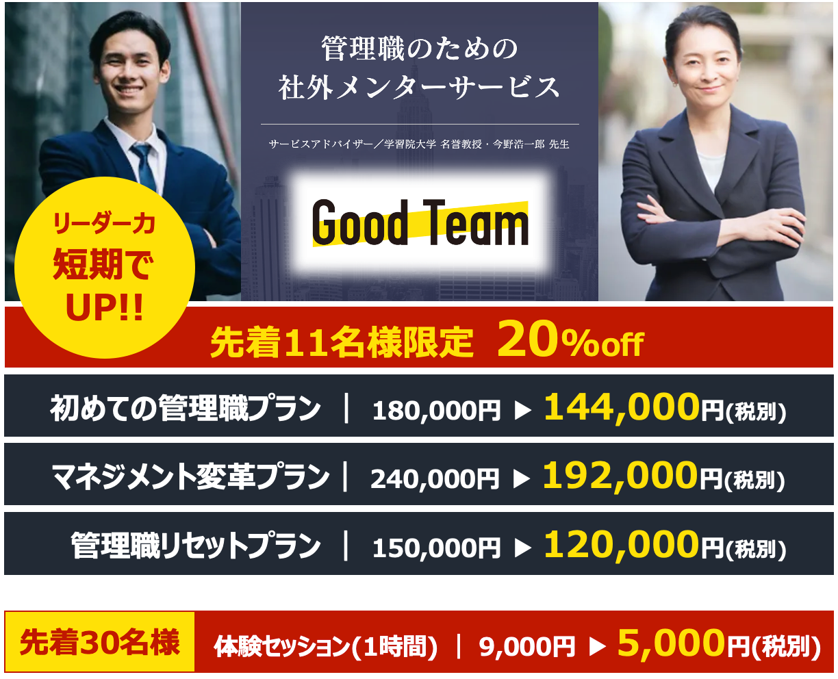 | サービス内容 | 管理職のための社外メンタープログラム『Good Team』 https://www.goodteam.jp/ 変化の激しい時代に成果を出すチームリーダーへ『チェンマネBOOTCAMP』 |