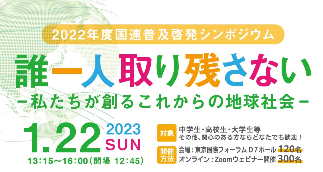 紛争、気候変動、感染症、広がる格差や差別…。世界はいま、さまざまな課題に直面しています。これらの課題を解決し、すべての人が心豊かに生きることができる世界へと向かっていくためには、これからの地球社会づくりを担う若い世代のみなさんが行動を起こすことが大切です。このシンポジウムでは、SDGsの理念でもある『誰一人取り残さない世界』を創るために、私たちに何ができるのかを一緒に考えます。