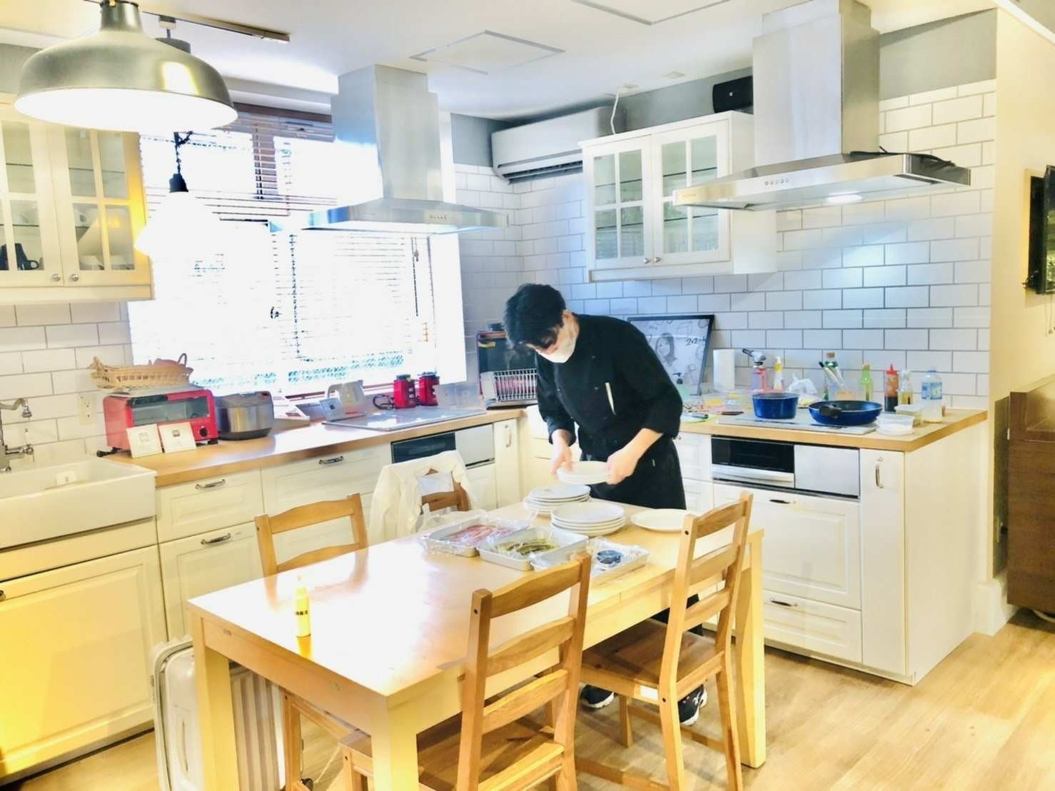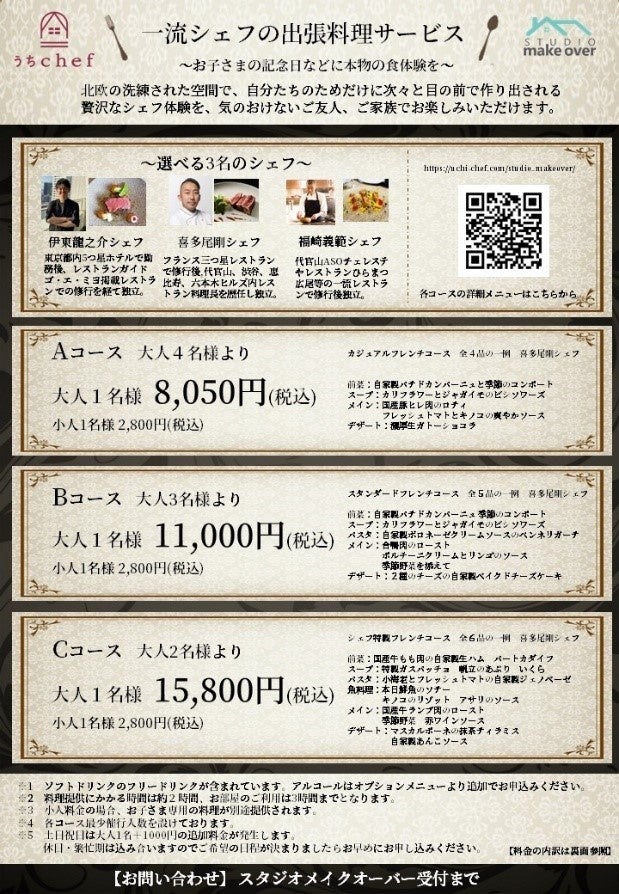 うちchef登録の一流シェフ3名による特別コースをご⽤意いたしました。キッチン設備を備えたスタジオメイクオーバーにシェフが出張し、コース料理を調理、提供、片付けまで⾏います。