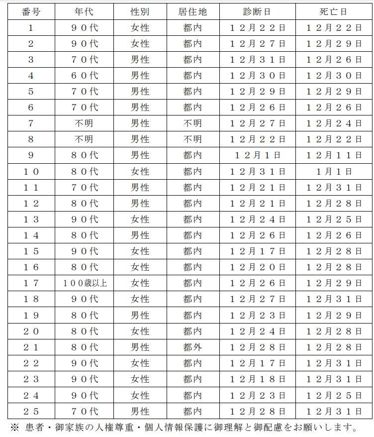 新型コロナウイルスに関連した患者の死亡について business Twitter Facebook はてブ Pocket LINE コピー 2023.01.04 この記事は約1分で読めます。 都内で新型コロナウイルスに感染した方が死亡されましたのでお知らせします。 お亡くなりになった方のご冥福をお祈り申し上げます。 1 新型コロナウイルスに関連した死亡者(本日公表分) 2 新型コロナウイルスに関連した死亡者の累計 6,875人