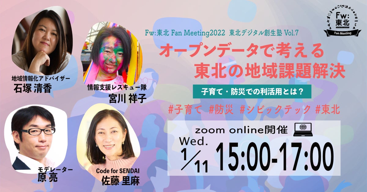 登壇者には、仙台のシビックテック団体、Code for SENDAIから、子育ての課題解決に注力している佐藤里麻さん、東日本大震災を契機にIT領域から防災活動を行っている一般社団法人情報支援レスキュー隊(IT DART)の宮川祥子さんをお招きして、それぞれの活動を伺うほか、総務省地域情報化アドバイザーとしても活動しているCode for Japan研究員の石塚清香さんも交え、オープンデータ利活用のポイントを探ります。