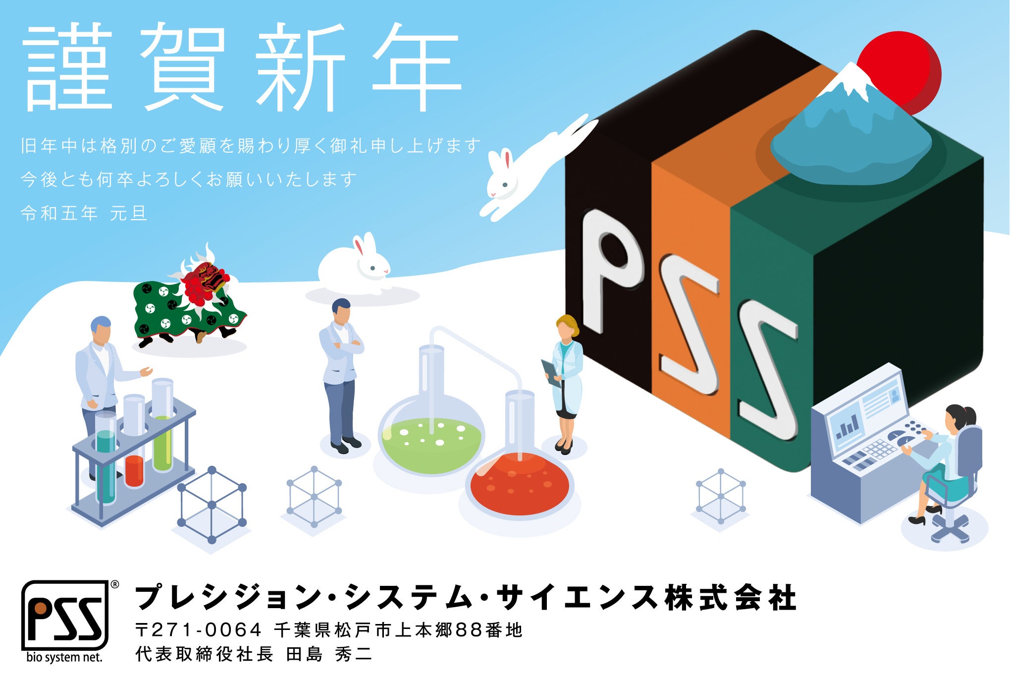 2023年はPSS社員、グループ一同、今後とも気を緩めず、新型コロナウイルス感染症蔓延の不幸を「転禍為福」として、一途に開発してまいりましたバイオ遺伝子解析システムのさらなる活用を目指し、臨床医療の分野での展開を拡大していく所存です。