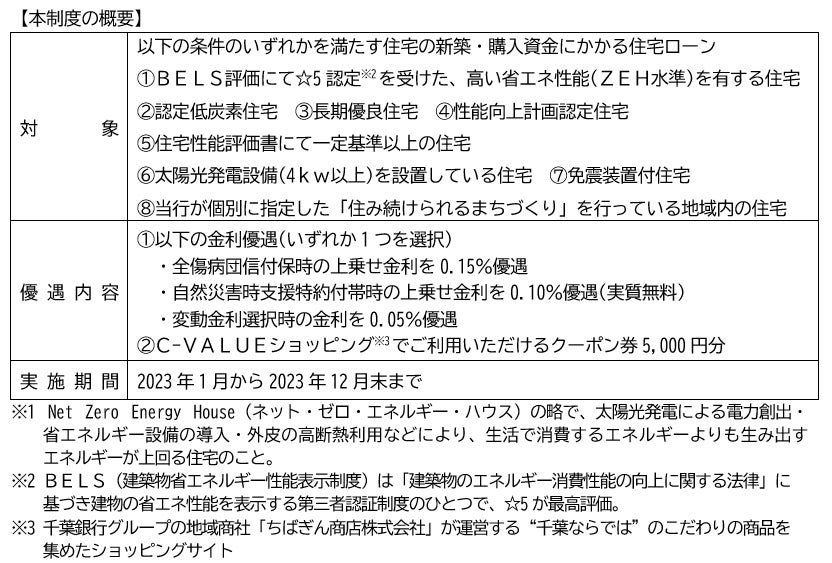 千葉銀行(頭取 米本 努)は、2023年1月4日(水)、環境に配慮した住宅の新築・購入に対する住宅ローン金利の優遇制度「サステナ住宅応援割!」を創設しましたのでお知らせします。