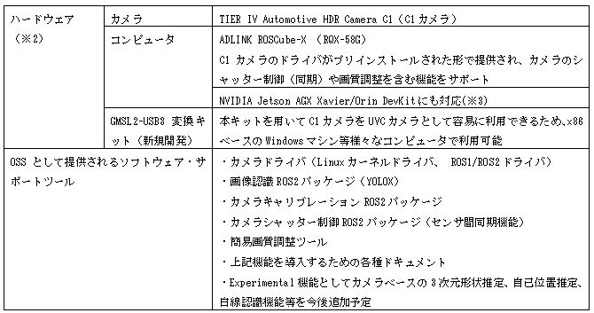 今回は、これまでC1カメラおよびAutowareのユーザから多く要望を頂いていたカメラパーセプション開発で実績のあるハードウェアおよびソフトウェアを、サポートツールや導入ドキュメントとともに開発キットとして提供を行います。