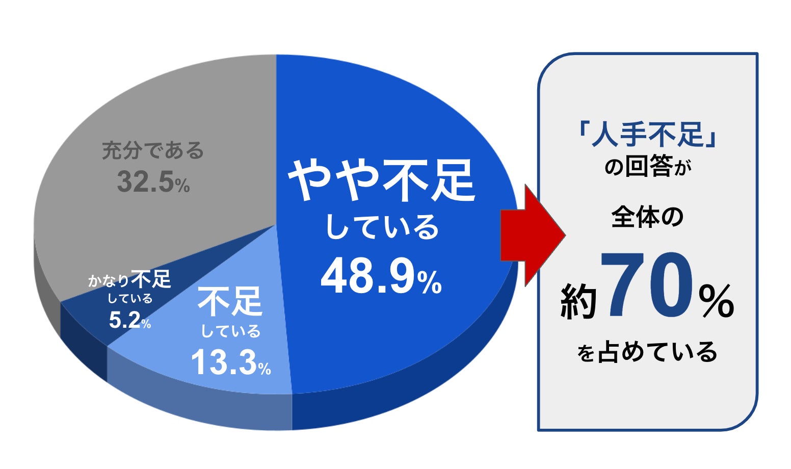 新型コロナウイルスの制限が緩和されるなか、飲食店では人手不足が日に日に深刻化してきています。飲食店経営者・運営者 総勢458名に対して、2022年5月に「貴店の従業員数が充分であるか」とアンケートを実施したところ、回答者の半数近くが「やや不足している(48.9%)」と回答。「不足している(13.3%)」、「かなり不足している(5.2%)」との回答と合わせると、67.4%が人手不足を感じている状況が明らかとなりました。「充分である」との回答はわずか32.5%でした。また、「雇用について今最も困っていること、懸念していること」を尋ねたところ、「優秀な料理人がいない」など、希望する人材を雇用できていないとの声が多くみられました。