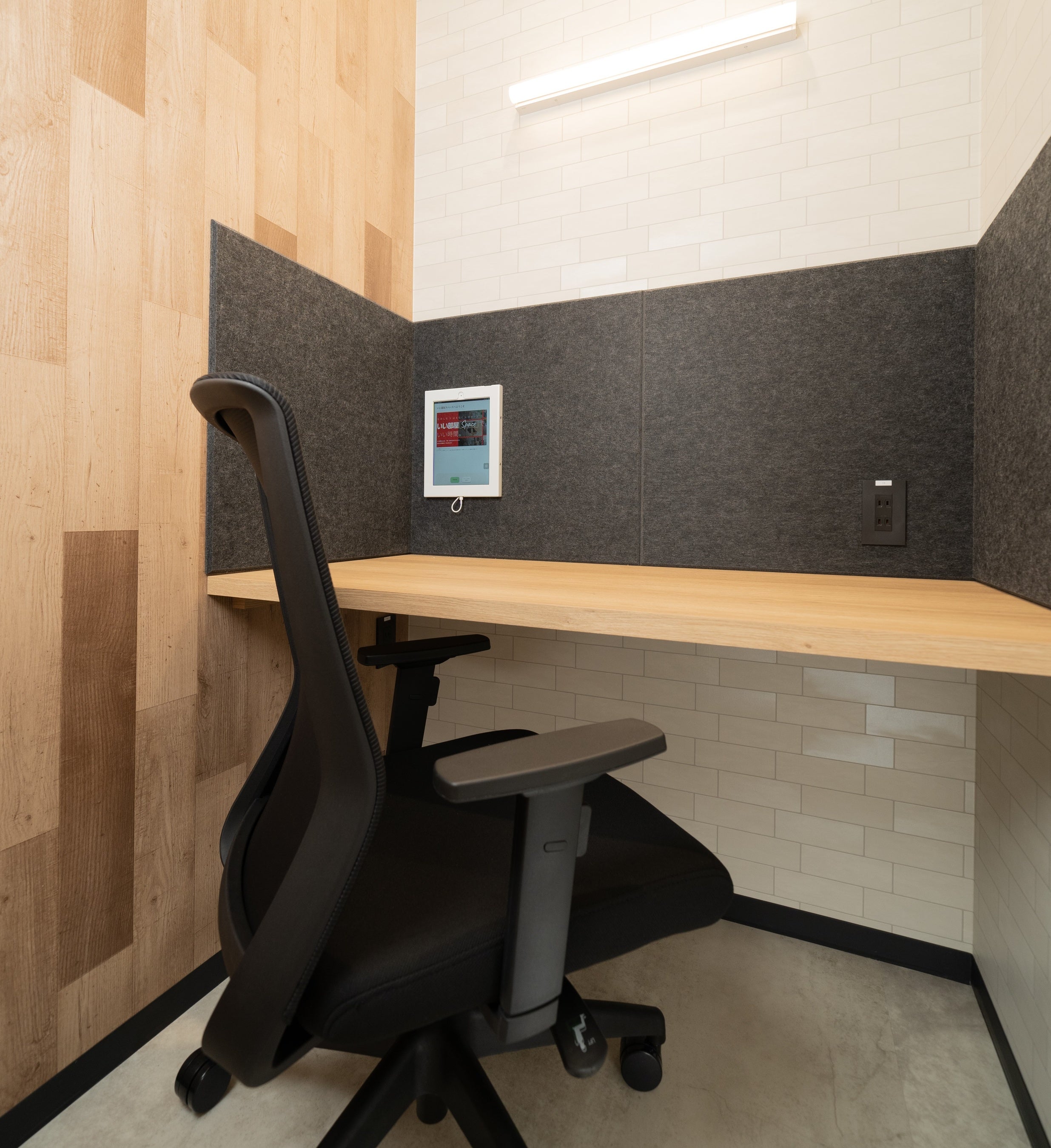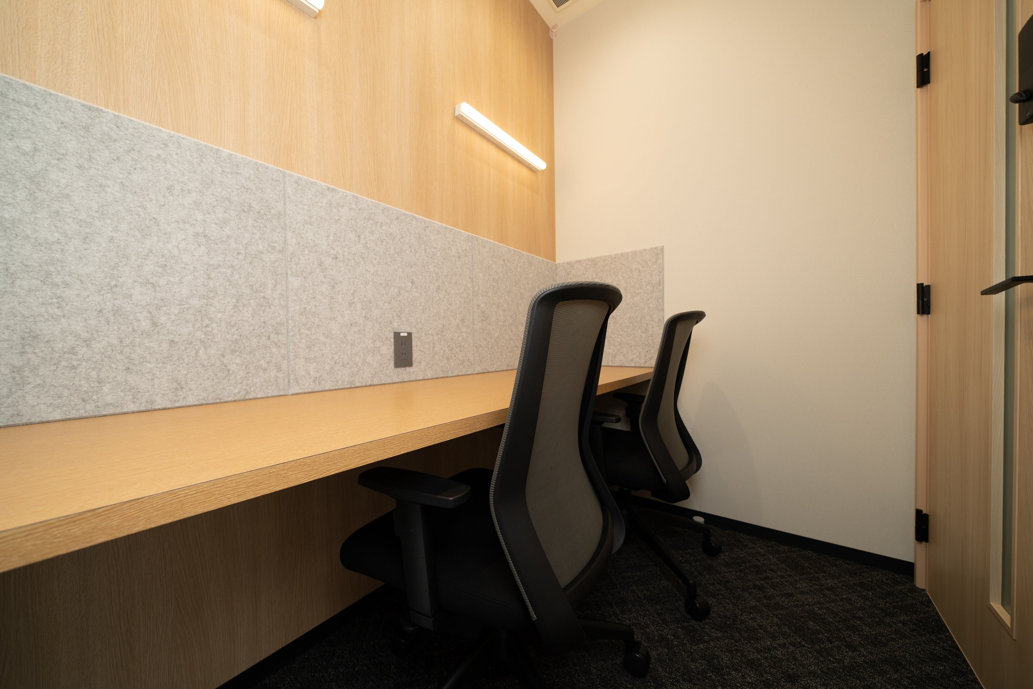 ベーシックでシンプルな内装の個室。充分な広さの2名用個室は、月額制の固定席としてもご利用いただけます。また、防音室は、楽器・声楽の練習や周りの音を気にせず集中して作業をされたい方に最適です。