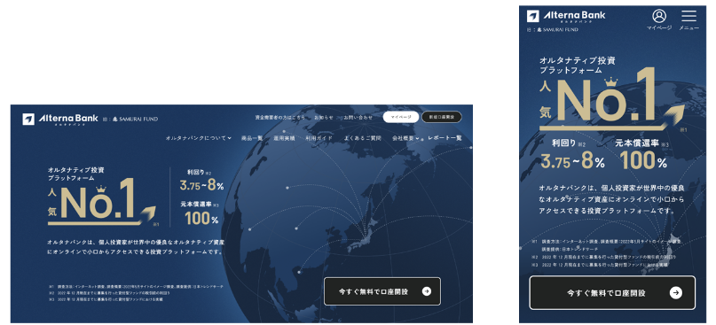 新たなブランドコンセプトのもと、ロゴやサイトデザインを一新し、オルタナティブ投資プラットフォーム「Alterna Bank(オルタナバンク)」として事業を拡大していきます。