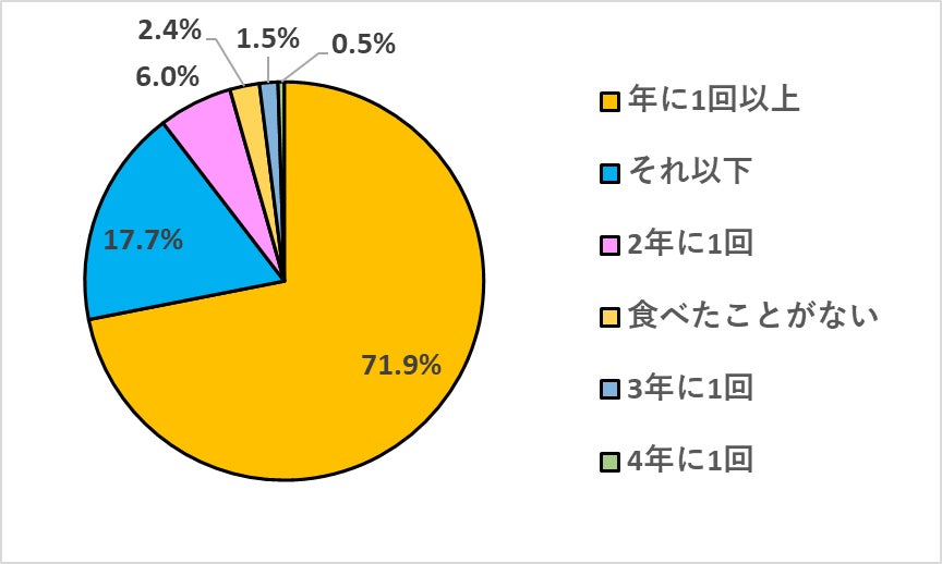 おせち料理を食べる頻度については、「年に1回以上」が71.9%、「それ以下」が17.7%、「2年に1回」が6.0%という結果になりました。年に1回以上食べる人が多いようですね。