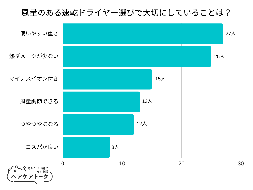 「風量のある速乾ドライヤー選びで大切にしていることは?」とアンケート調査した結果、1位は『使いやすい重さ』でした。