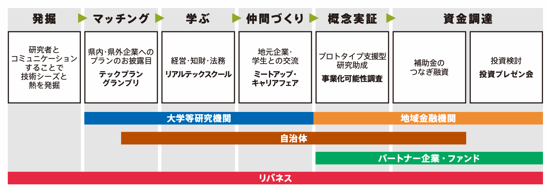 リバネスが目指すのは、日本の各地が独自の自然環境、文化、歴史に裏づけられた知識をもとに新産業を創出することです。そして、地域で育成していくべき産業の種となるのが、大学や研究機関等で日々磨かれている技術シーズであると考えます。本サービスでは、自治体や地方銀行を対象として、技術シーズを発掘し、産官学金が連携をして社会実装にむけて伴走支援を行うことで、研究開発型ベンチャー企業を創出し、世界の課題を解決するビジネスを生み出すためのエコシステムを構築します。