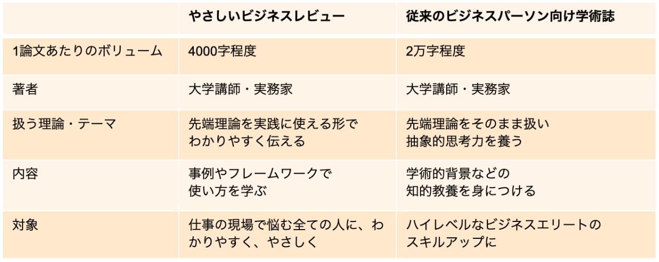 そこで、最先端の学説・手法を、コンパクトに、使い勝手よく、かつ厳選して届けるアカデミア発の雑誌があってよいのではないか、との考えから、「やさしいビジネスレビュー」は生まれました。