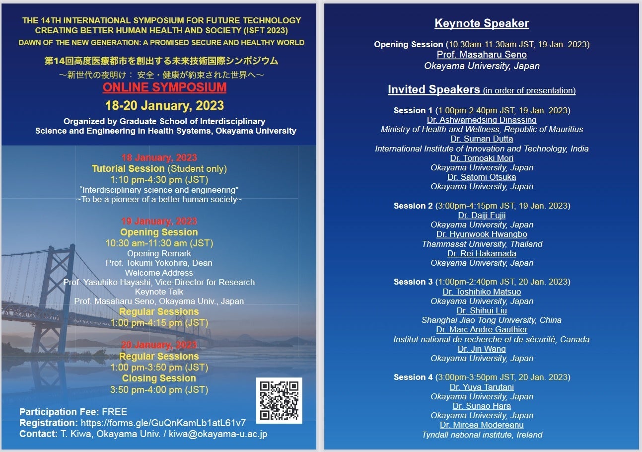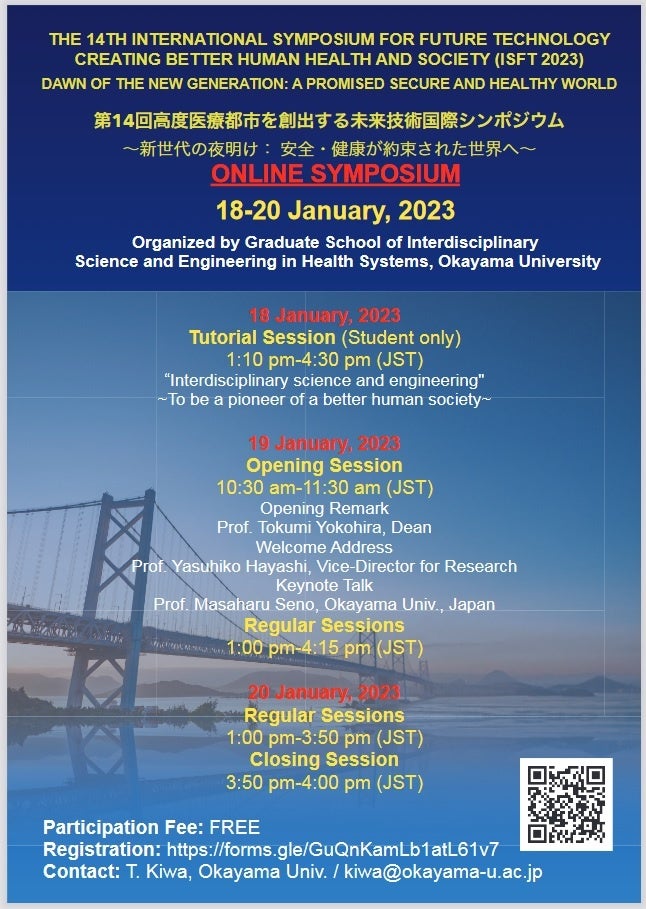 国立大学法人岡山大学(本部:岡山市北区、学長:槇野博史)のヘルスシステム統合科学研究科では、「The 14th International symposium for future technology creating better human health and society (ISFT2023) ~Dawn of the new generation: a promised secure and healthy world~」(第14回高度医療都市を創出する未来技術国際シンポジウム~新世代の夜明け:安全・健康が約束された世界へ~)と題し、国際シンポジウムを2023年1月18日(水)~20日(金)にzoomによるオンラインで開催いたします。