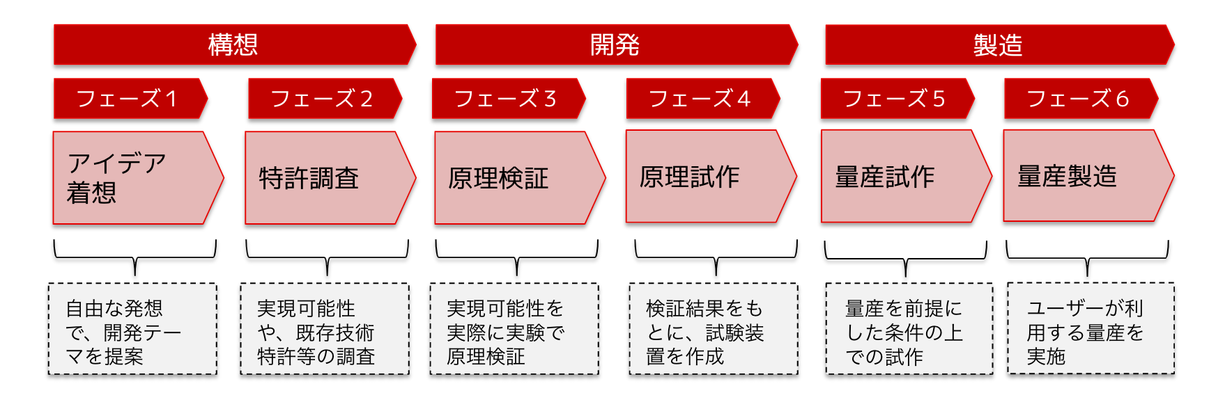 プロトタイピングラボは、新たな製品製造において、構想段階から製造段階まで、製造の6つのフェーズそれぞれにおけるワンストップの製造支援サービスです。フェーズごとに納品物が設定されており、ニーズに合わせて適切なフェーズからサービスを開始することが可能です。