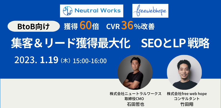 株式会社free web hope(本社:東京都千代田区、代表取締役:相原ゆうき)は、無料のオンラインセミナー「BtoB向け 集客&リード獲得最大化のSEOとLP戦略」を1月19日(木)に開催いたします。(申し込みURL:https://share.hsforms.com/1303RzWMDSG2SjA5LYhChBg5fwo5)