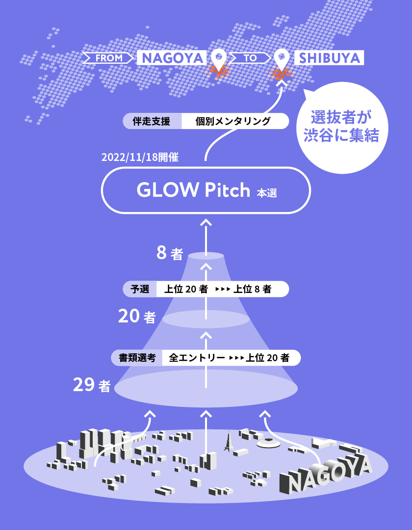 名古屋市主催、東海エリア最大級のピッチイベント「GLOW Pitch」の入賞スタートアップ8社が、「Growing Support Program」のメンタリング支援を通じてさらに磨き上げられたピッチを披露します。IT/製造/建設/医療/バイオと様々な領域で、独自のテクノロジーに強みのある名古屋地域のスタートアップが、日本のスタートアップ中心地である渋谷でさらなる飛躍を目指します。