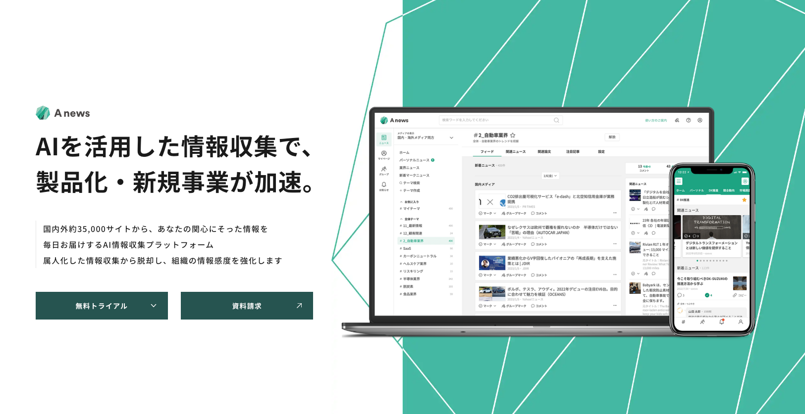 『Anews』は国内外約3万5千サイトの膨大な情報から、AIが組織や業務に合わせて必要な情報を届け、組織の情報感度を高める情報収集サービスです。