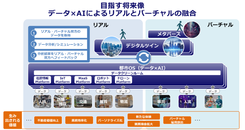 ・「デジタルツイン」(注2)の導入に向け検討を進めます。リアル・バーチャルから得たデータを活用し、都市OSにてデータの分析/シミュレーションを行い、その結果をもとにリアル・バーチャル双方にさまざまな価値を提供していく未来を目指します。