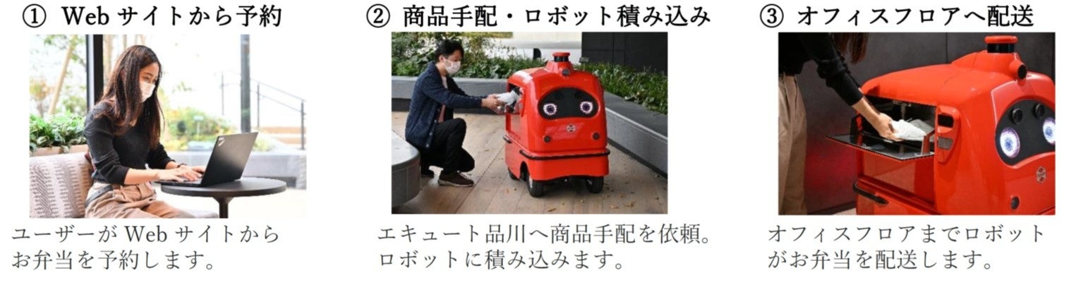 JR目黒MARCビル内で勤務するオフィスワーカー向けに、事前に注文いただいたお弁当を時間通りにオフィスフロアまで配送するサービスのほか、JR品川駅のエキナカ商業施設「エキュート品川」で販売しているお菓子・軽食を、ビル内(ラウンジ/ロビー/フロアなど)の人の多い場所に移動して回遊販売するサービスを試験的に提供します。