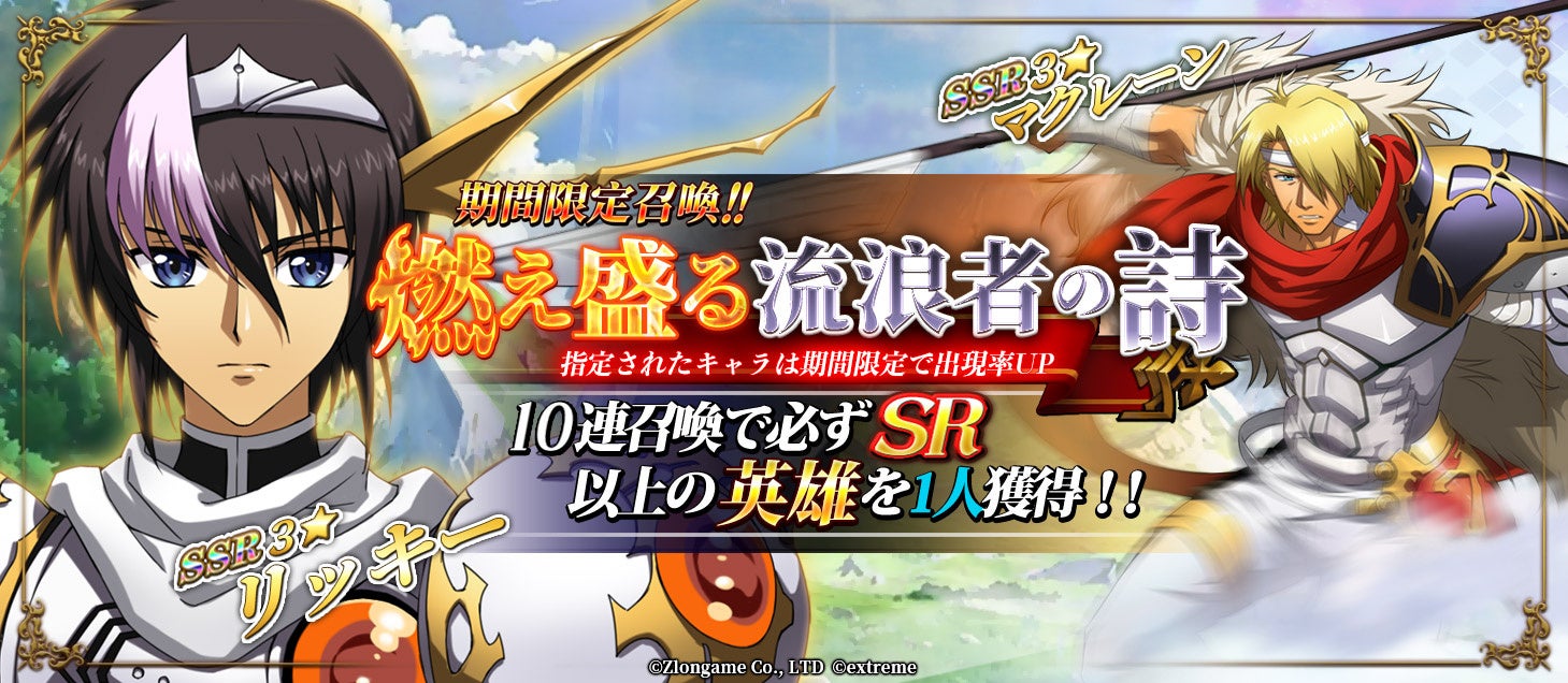 『燃え盛る流浪者の詩』は10連召喚で必ずSR以上の英雄を一人獲得できる、期間限定召喚です。SSRマクレーン、SSRリッキーの出現確率が期間限定でアップします。