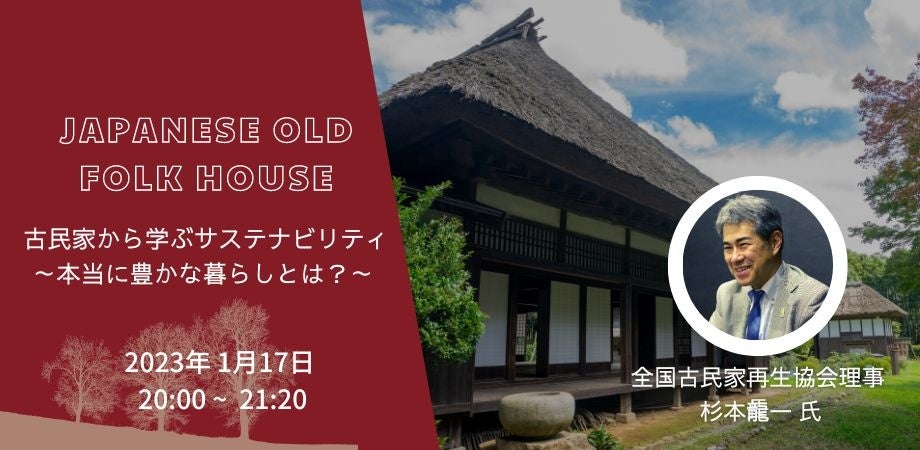 イベントでは、全国古民家再生協会理事長の杉本龍一氏によるプレゼンテーションで古民家の魅力を感じていただきながら、古民家の保存にまつわる課題や事例を考えていきます。サステナブルに暮らすためのヒントや、どんな住宅を次世代に残していきたいか、世界中の仲間と一緒に考えてみませんか?